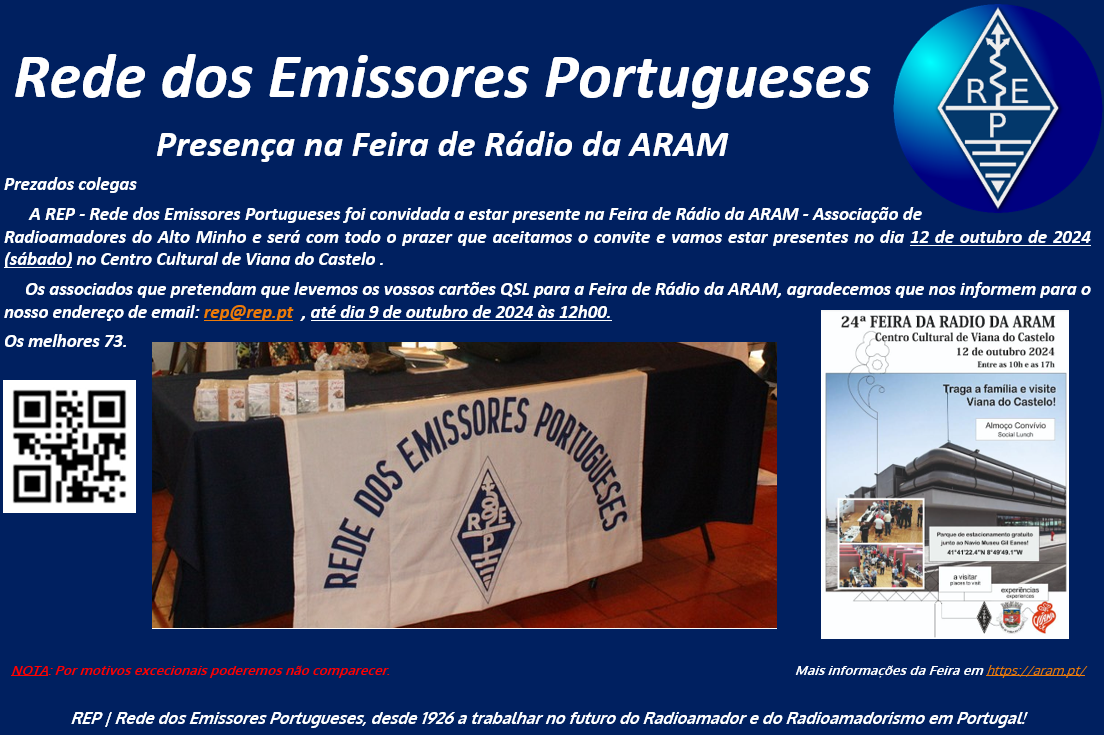 A Rede dos Emissores Portugueses foi convidada a estar presente na 16ª Feira da Rádio da ARAM – Associação de Radioamadores do Alto Minho, é com todo o prazer que vamos estar presentes no dia 10 de outubro de 2015 a realizar-se em Viana do Castelo.