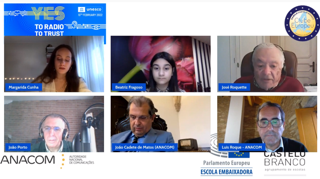 João Cadete Matos, Presidente da ANACOM, e Luís Roque Pedro, Diretor da Delegação da ANACOM do Porto, participaram na comemoração do Dia Mundial da Rádio, a 13 de fevereiro de 2022, no evento promovido pelo Clube Europeu do Agrupamento de Escolas Camilo Castelo Branco, Escola Embaixadora do Parlamento Europeu, em Vila Nova de Famalicão.